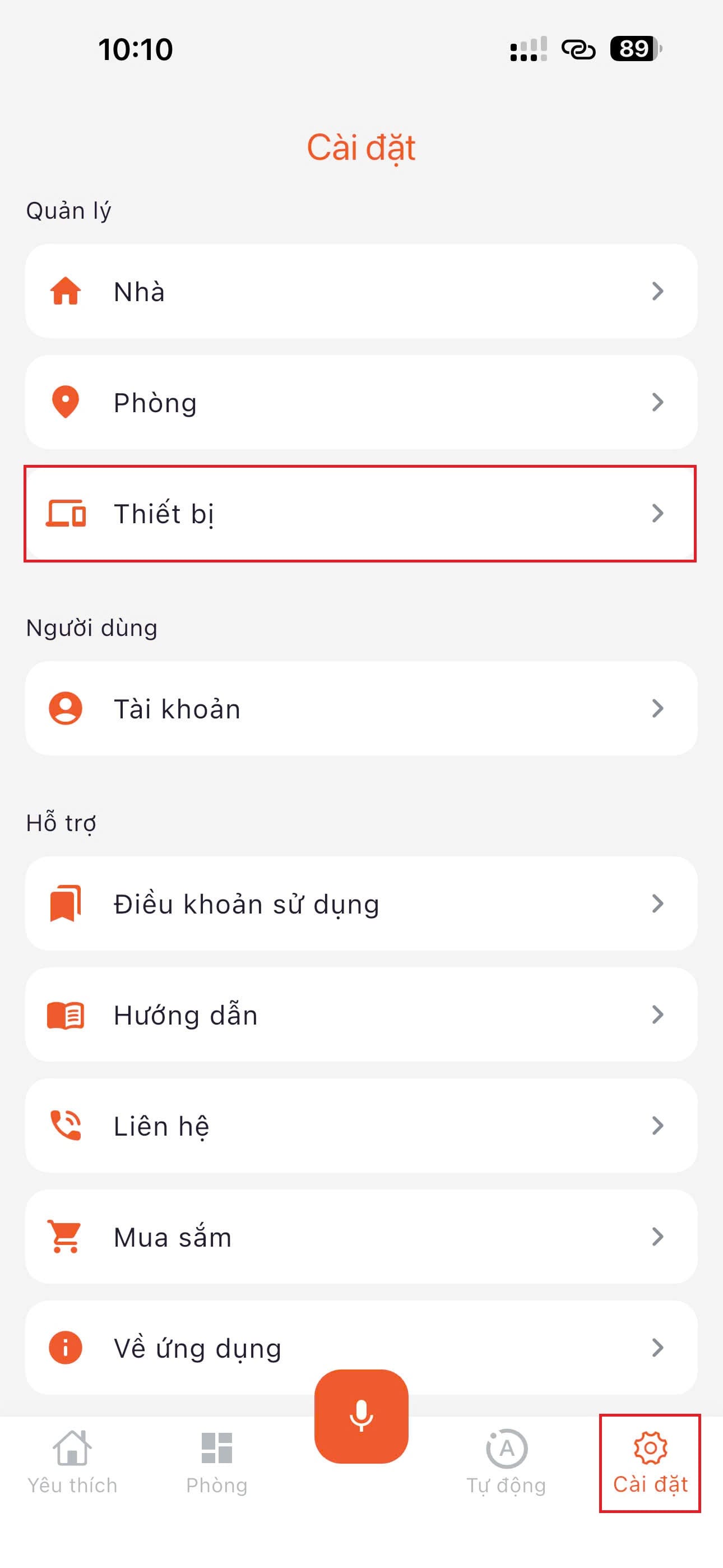 - Tại màn hình chính của ứng dụng chọn "Cài đặt", sau đó chọn "Thiết bị".