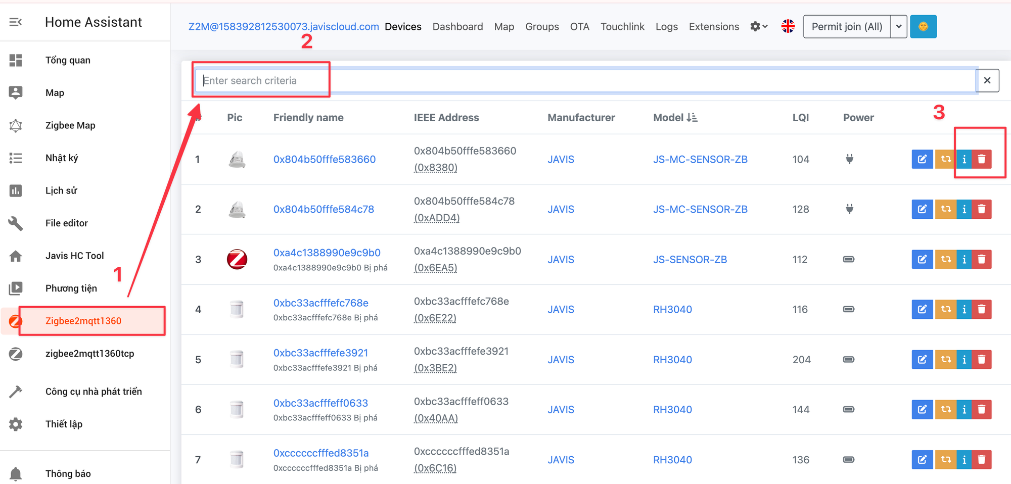 - Sau đó vào menu zigbee2mqtt trên trang quản lý HC nội bộ như dưới đây và gõ 1 phần ID của thiết bị zigbee để tìm.