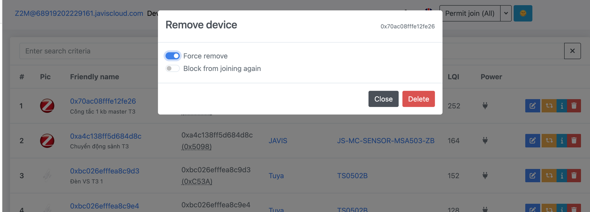 - sau đó bấm vào icon xóa thiét bị zigbee đó khỏi Javis HC, lưu ý chọn "Force remove" như dưới đây:
