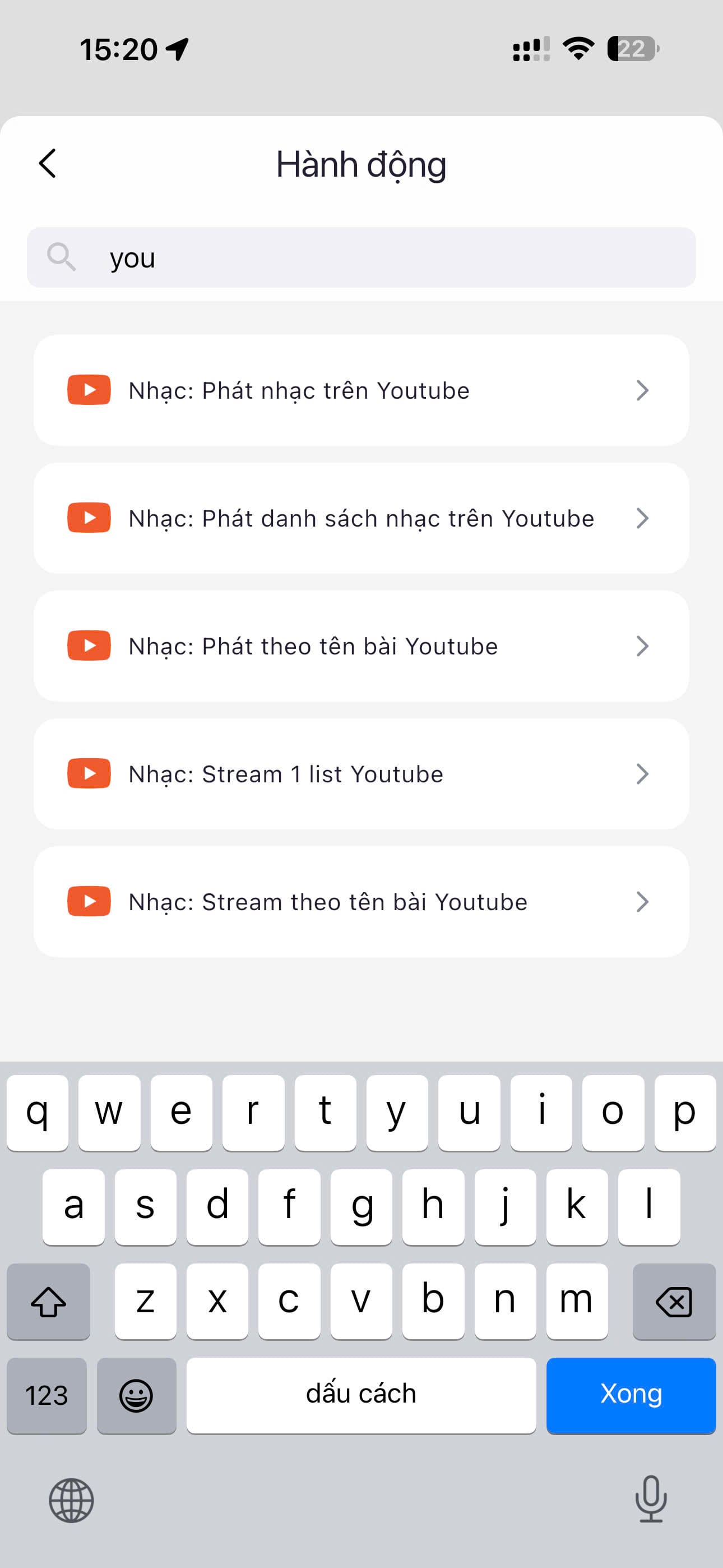 Trong phần này bạn cần chọn hành động tên là "Nhạc: Phát nhạc trên Youtube" (nên gõ 1 phần tên của hành động ví dụ từ "you" như ảnh dưới để tìm cho nhanh)