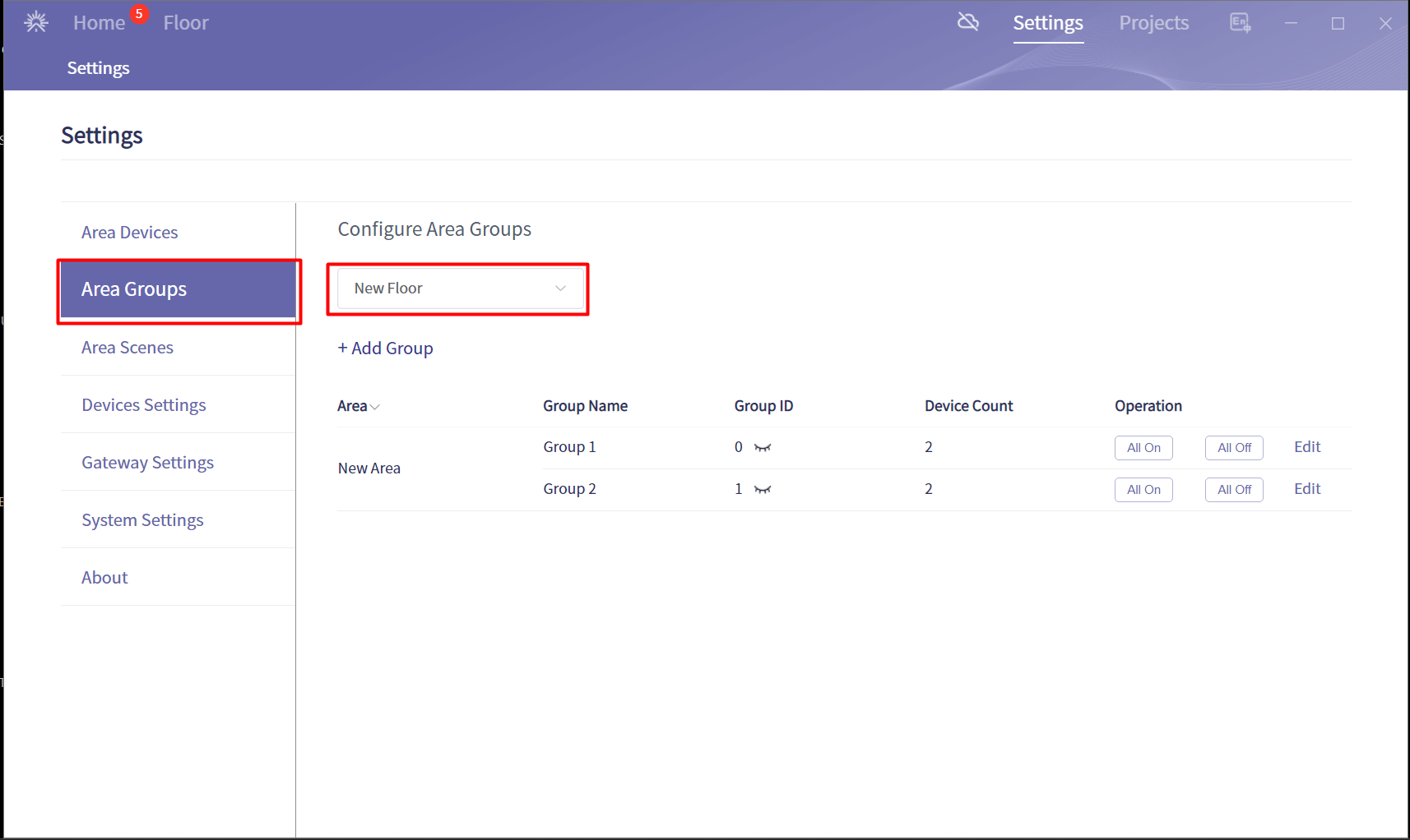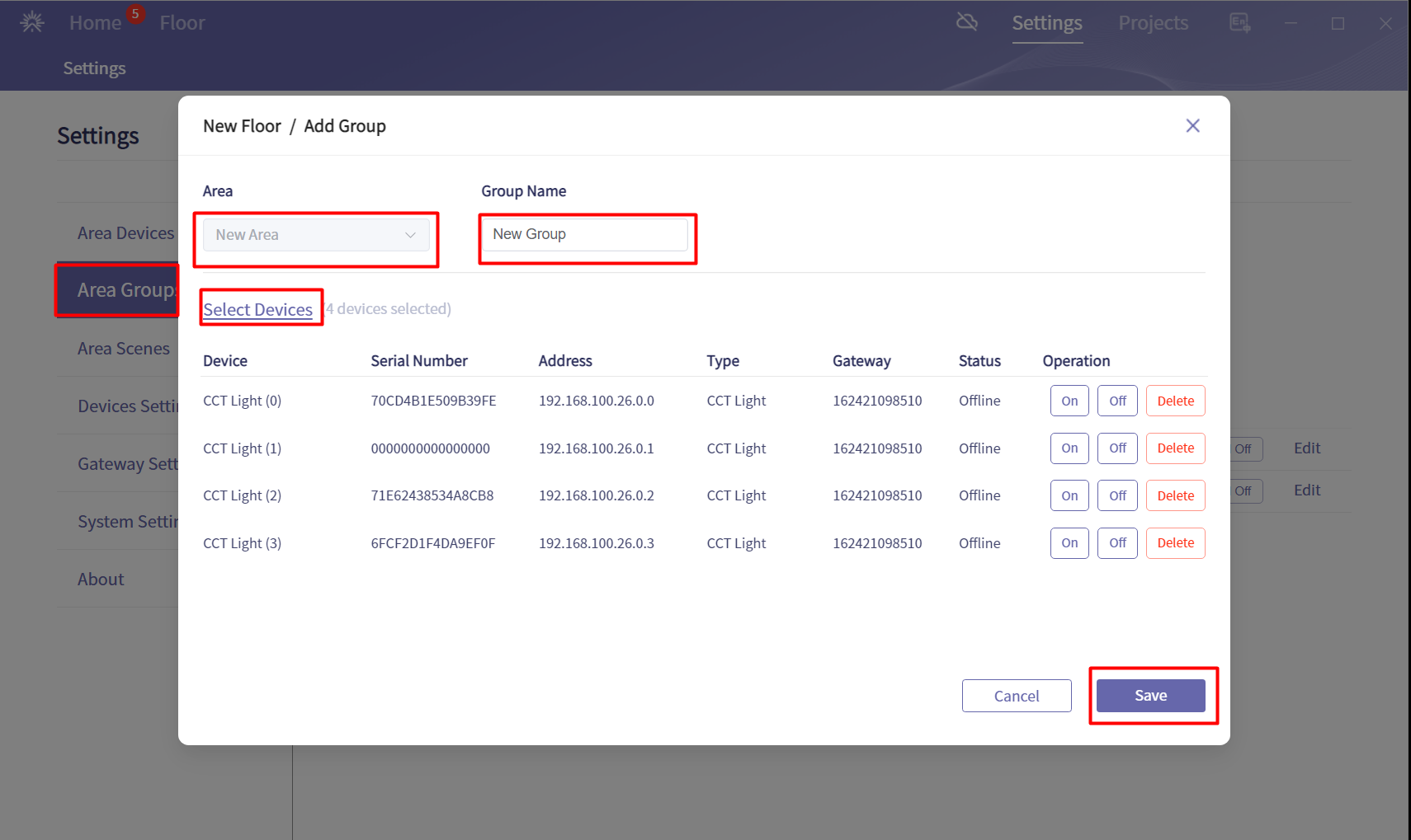 -Ở tab bên trái chọn Area Groups - Edits - Select Devices. Các thiết bị được chọn sẽ hiện ra màn hình ->Save