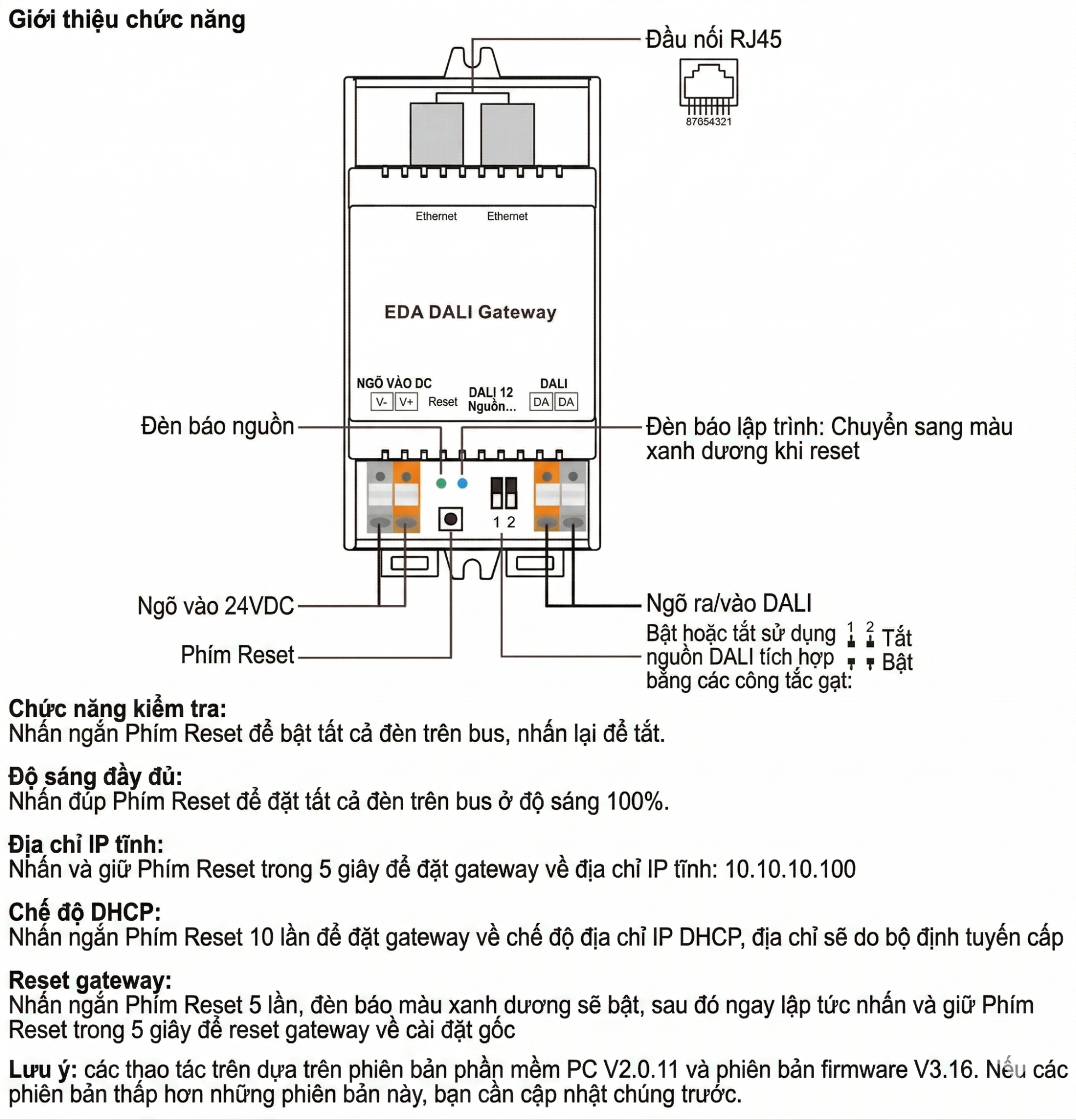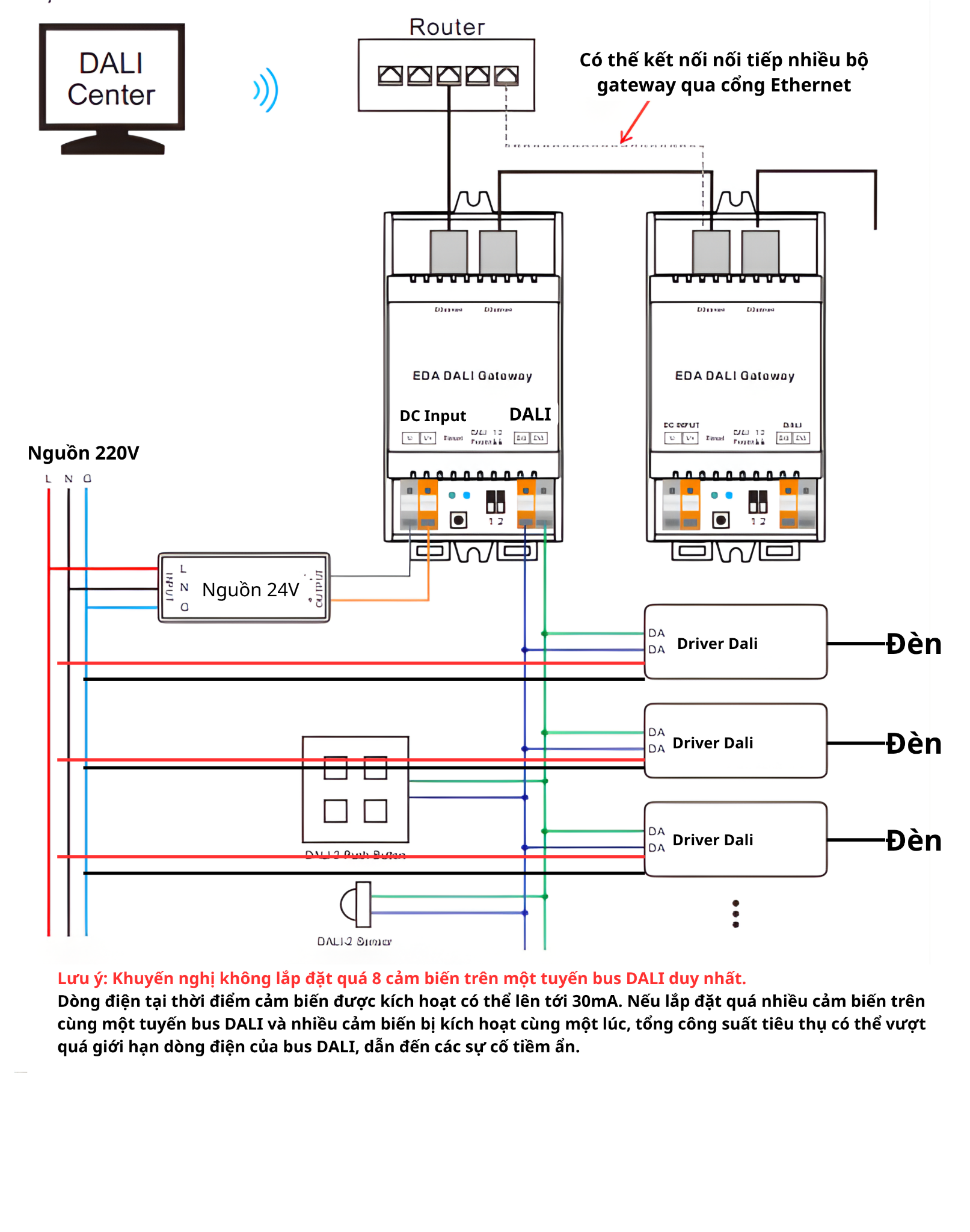 - Driver Dali sử dụng Nguồn 220V. Driver và Gateway đấu với nhau qua đường bus Dali DA-DA