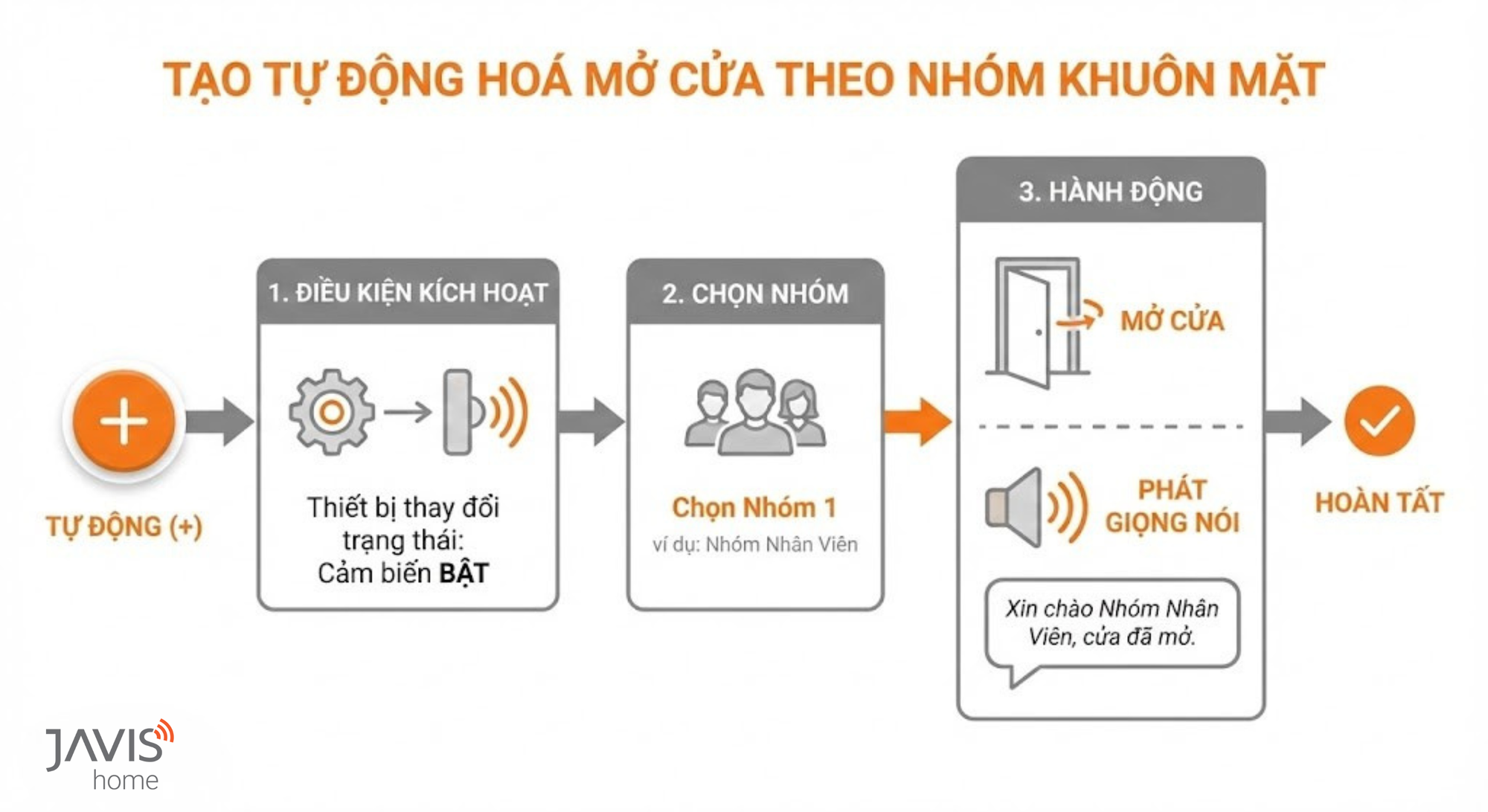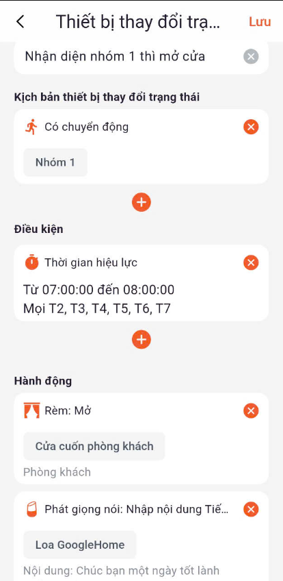 Ví dụ: Tạo tự động hóa những người trong “Nhóm 1” khi đến camera số 1 nhận diện từ 7:00-8:00 thì sẽ mở cửa và phát lời chào