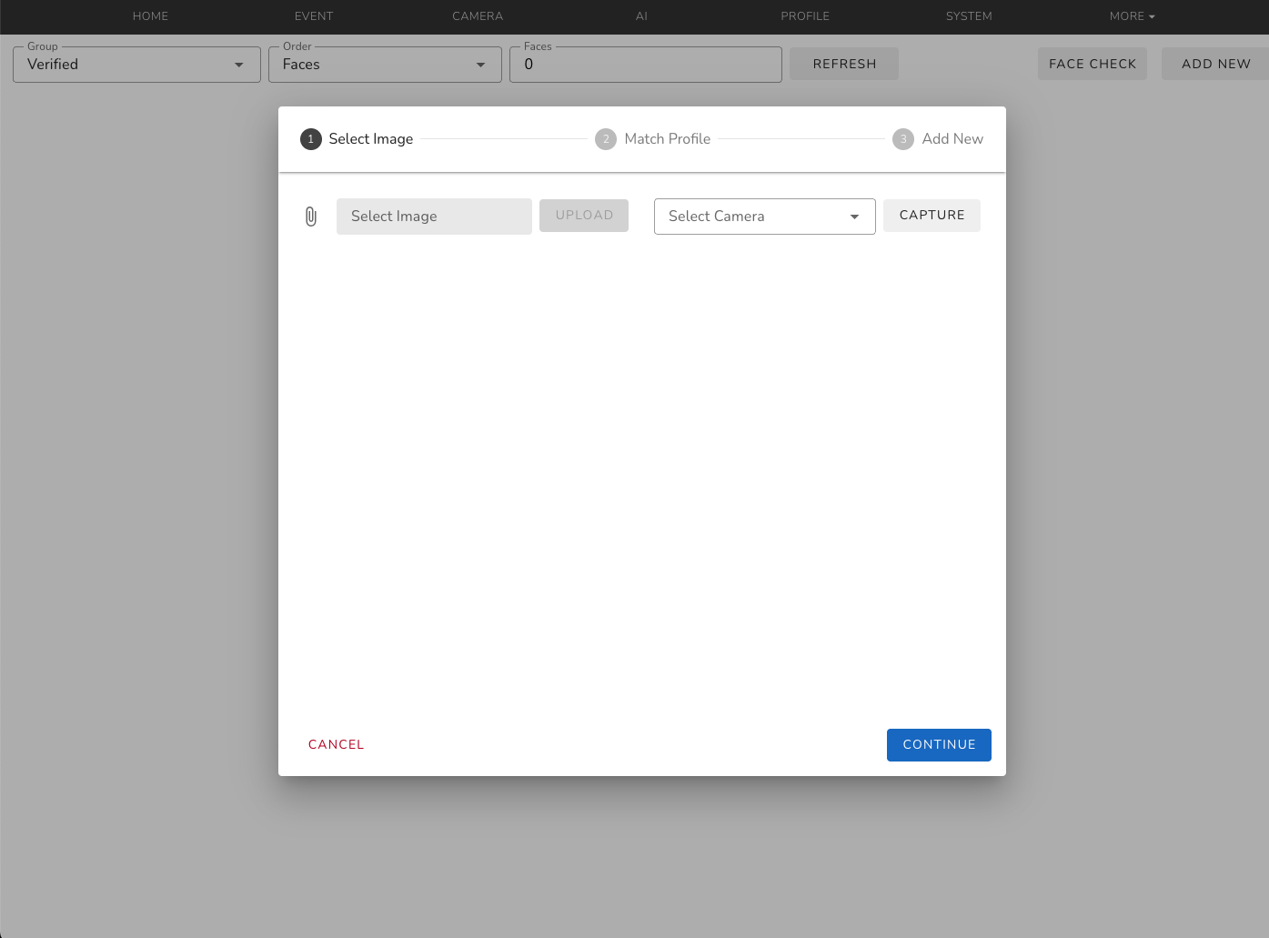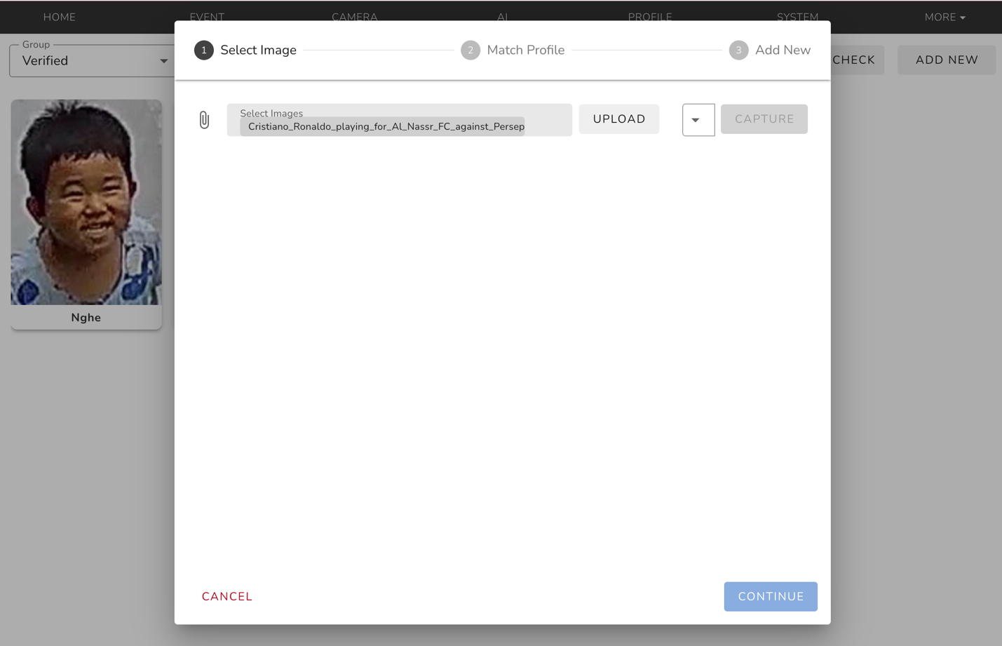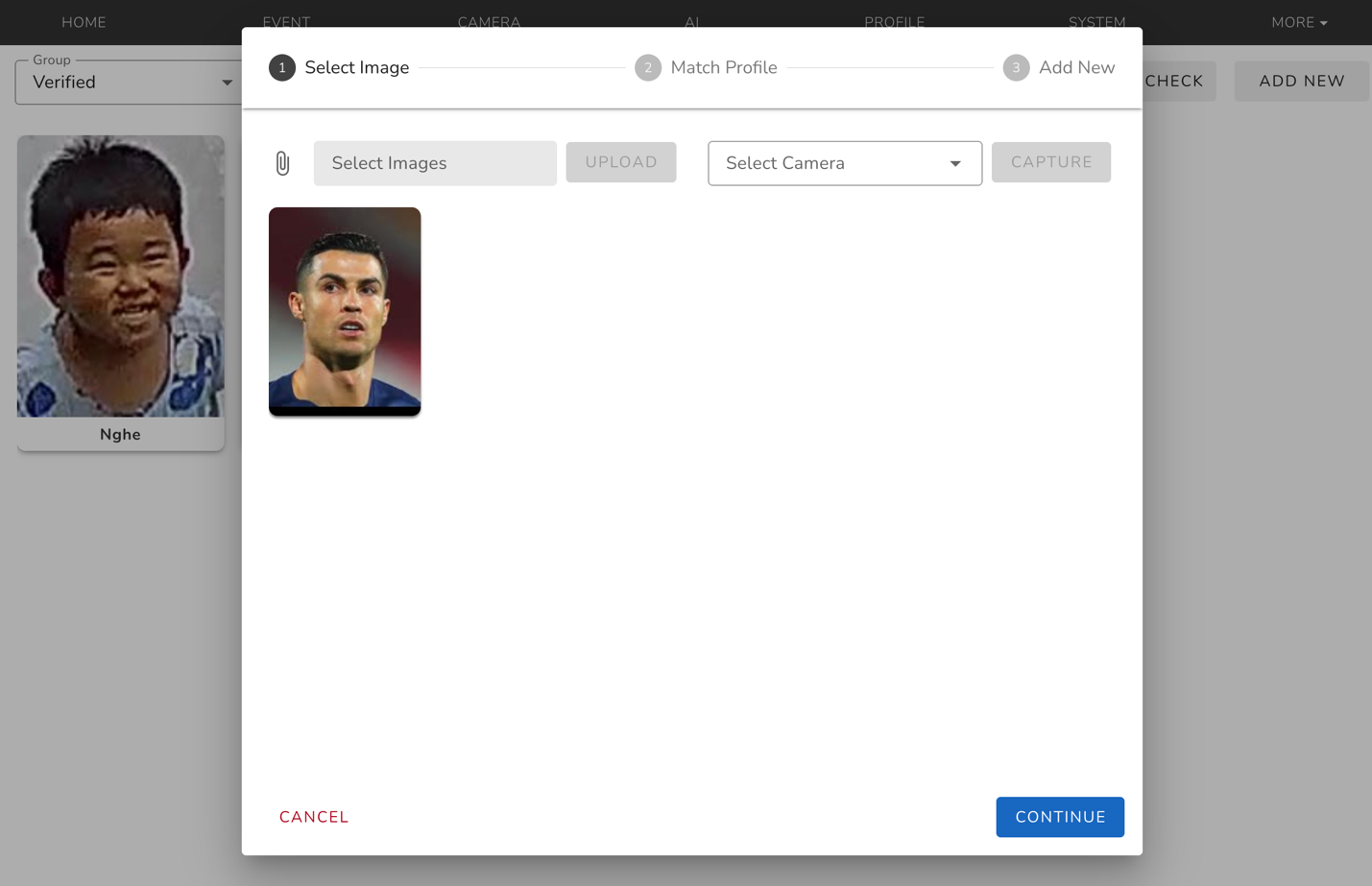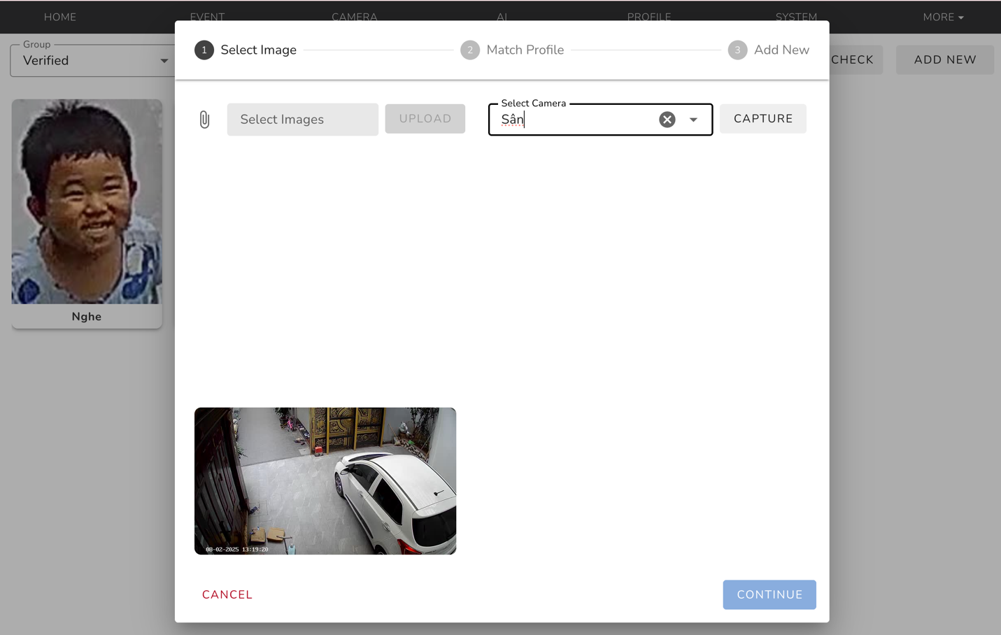 Ở bước Select Image, Bấm chọn camera muốn lấy ảnh khuôn mặt (đã thêm vào hệ thống trước đó), đứng trước camera ở khoảng cách vừa phải. Bấm nút CAPTURE để tự động chụp ảnh và căt khuôn mặt đang có trong khung hình.