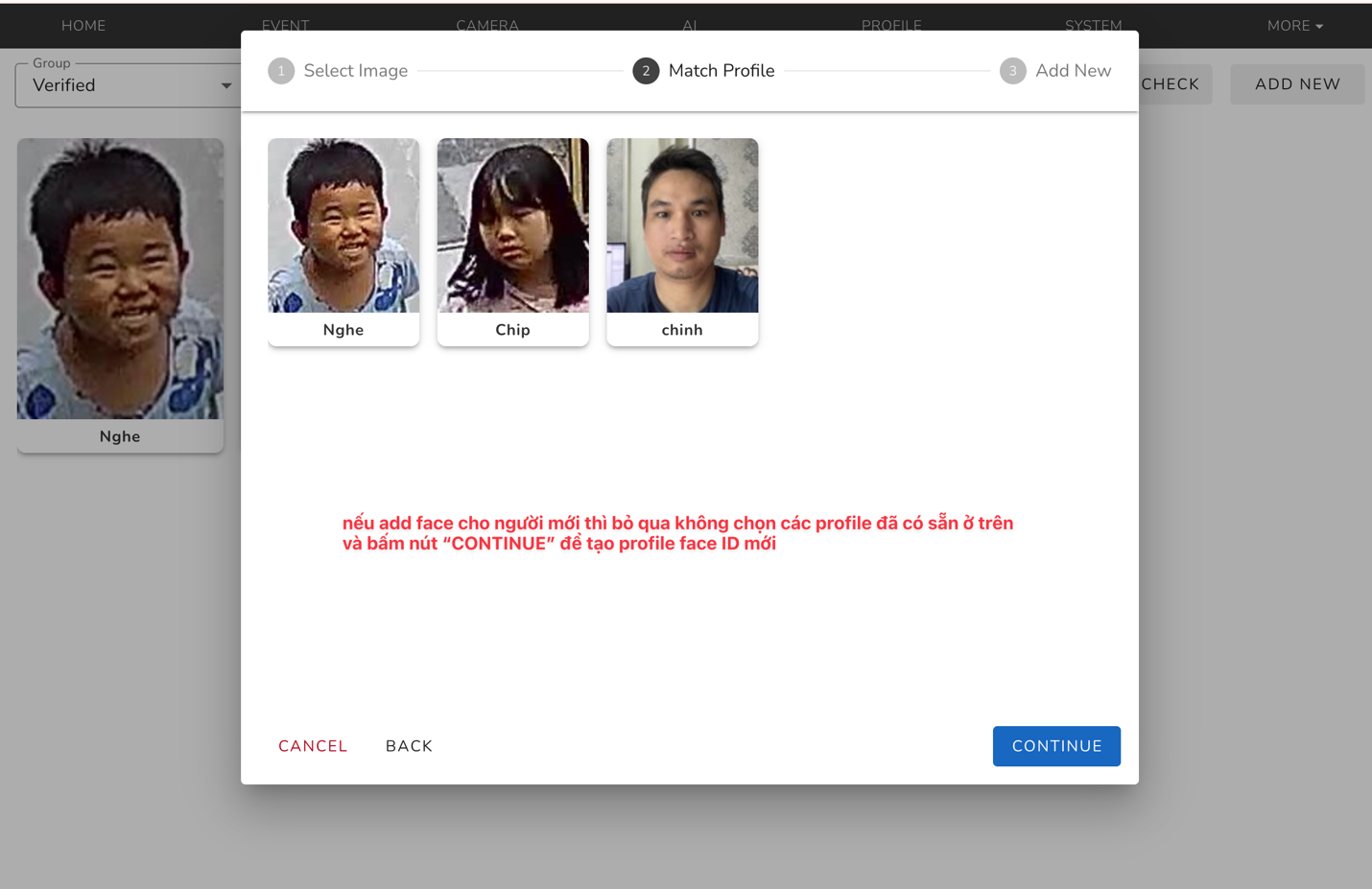 - Nếu muốn tạo faceID mới: trường hợp người được lấy mẫu chưa có faceID trong hệ thống, bỏ qua bước này không chọn faceID đã có để chuyển sang Step 3 tạo faceID (Profile) mới
