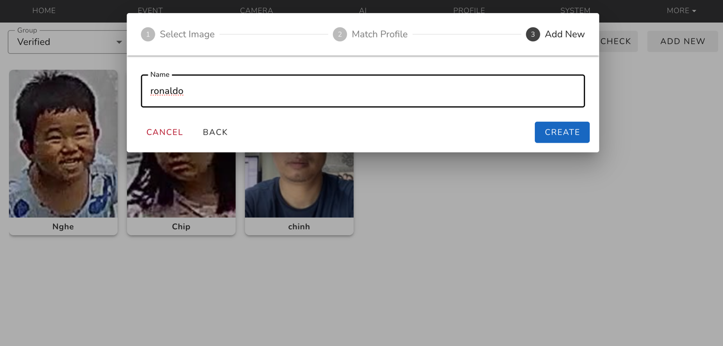 Màn hình thêm mới Profile để tạo các faceID, mỗi faceID ứng với 1 người cụ thể.