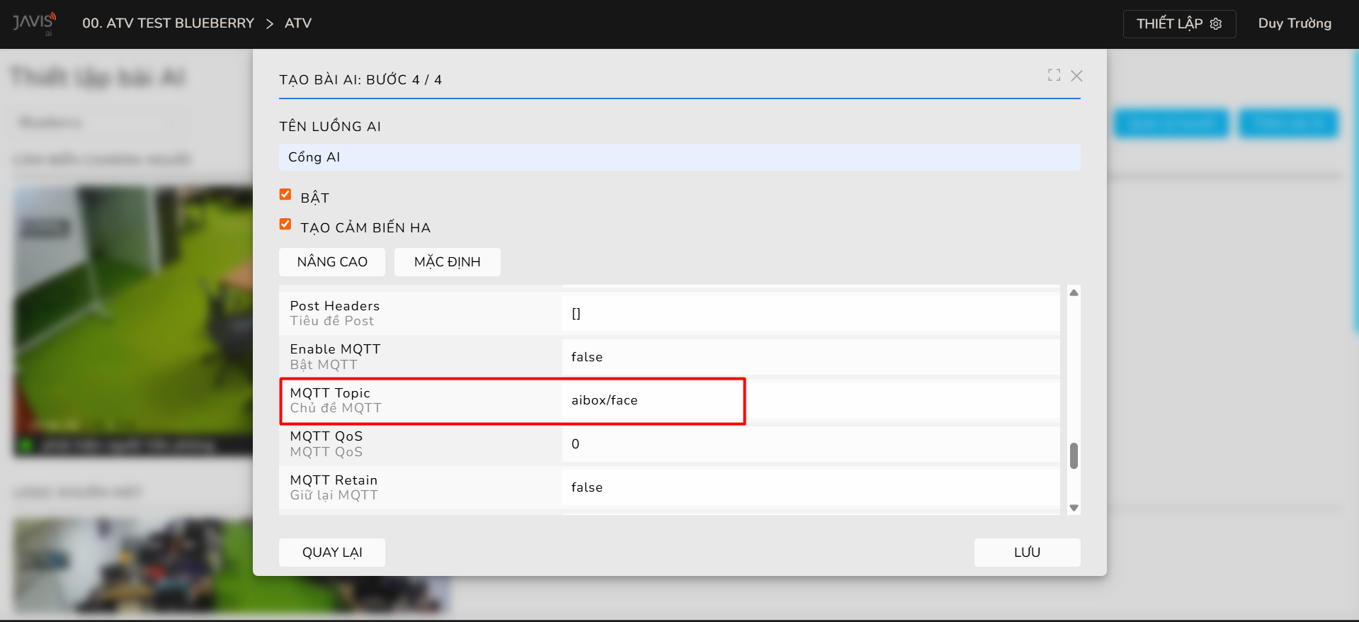 Mỗi bài AI nhận dạng khuôn mặt sẽ ứng với 1 MQTT topic duy nhất. Đặt tên topic là duy nhất, không có dấu cách, không trùng với topic đã tạo ->Lưu