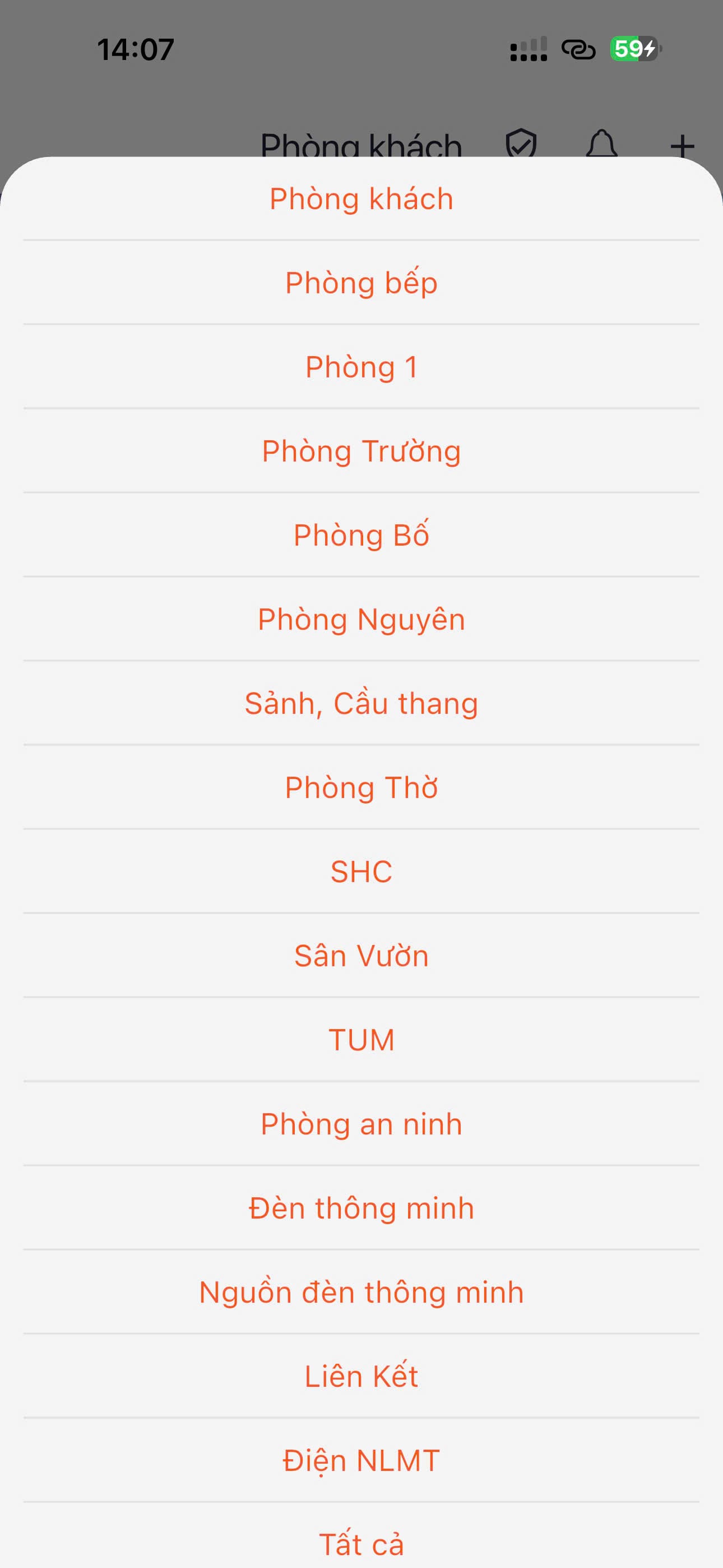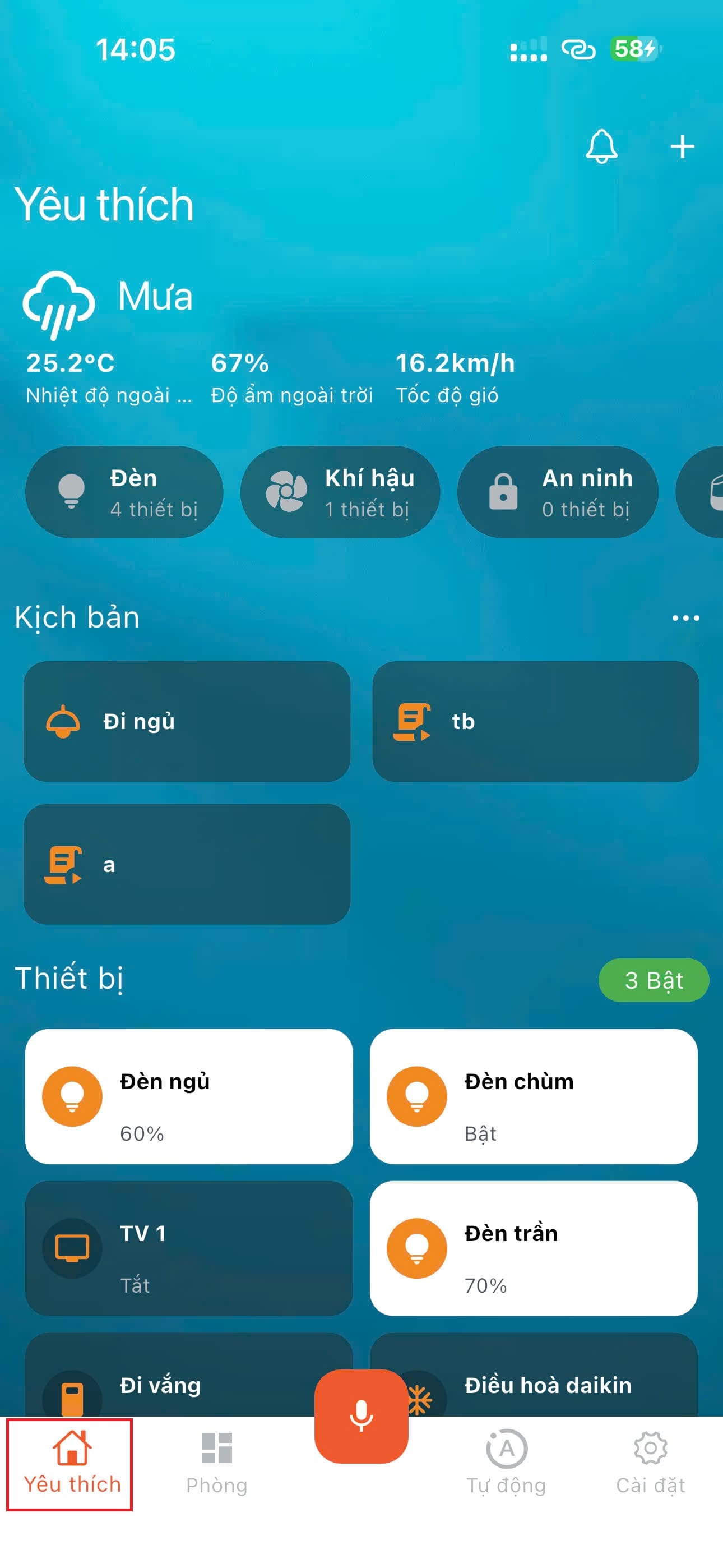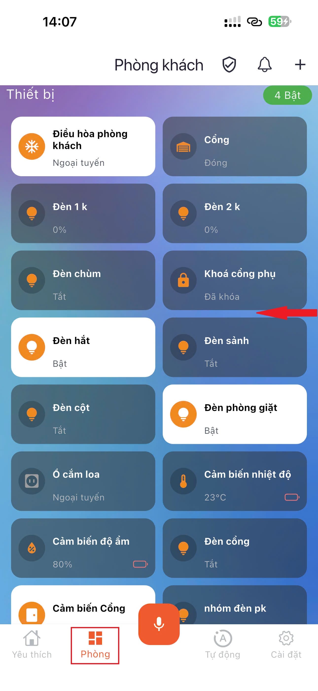 Khi ở màn hình yêu thích hoặc màn hình phòng, các thiết bị hiển thị dạnh danh sách (lưới), với các thiết bị hỗ trợ bật tắt thì hầu hết sẽ bấm chạm để tắt mở.