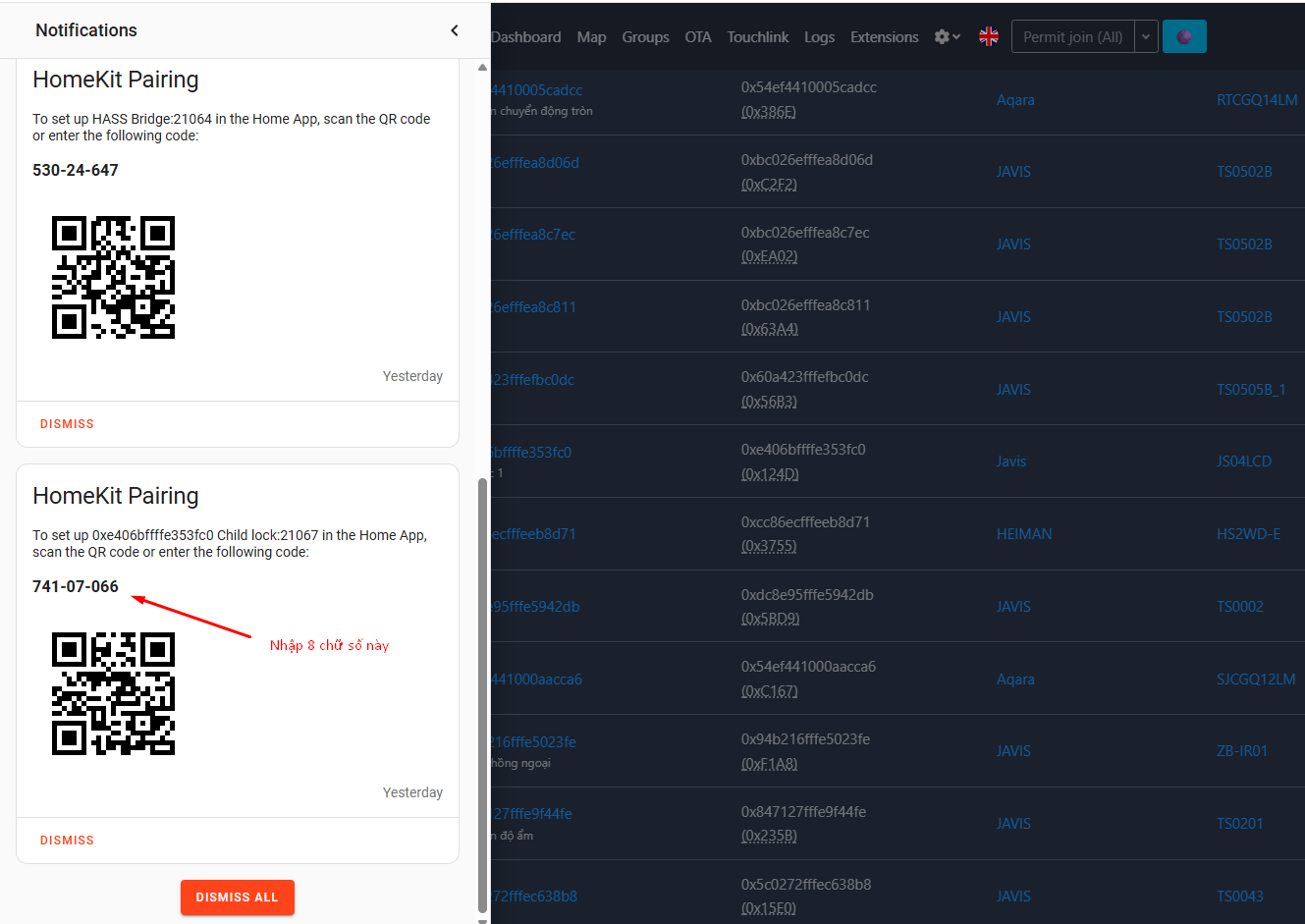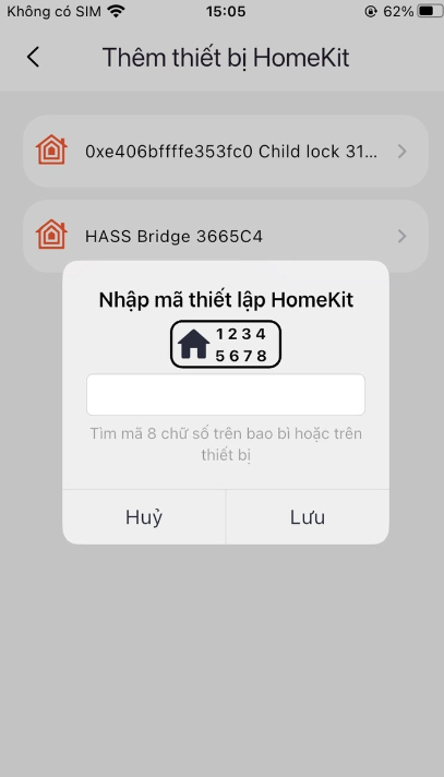 ( Chú ý : Mở trang truy cập nội bộ của bộ HC cần add thiết bị \ Chọn Notifications \ Chọn Home kit Pairing của khóa đó và nhập 8 chữ số tương ứng là mã thiết lập Homekit). Nếu chọn Notifications chưa thấy cập nhật Home pairing thì cần khởi động lại HC để hệ thống cập nhật Home pairing gồm 8 chữ số)
