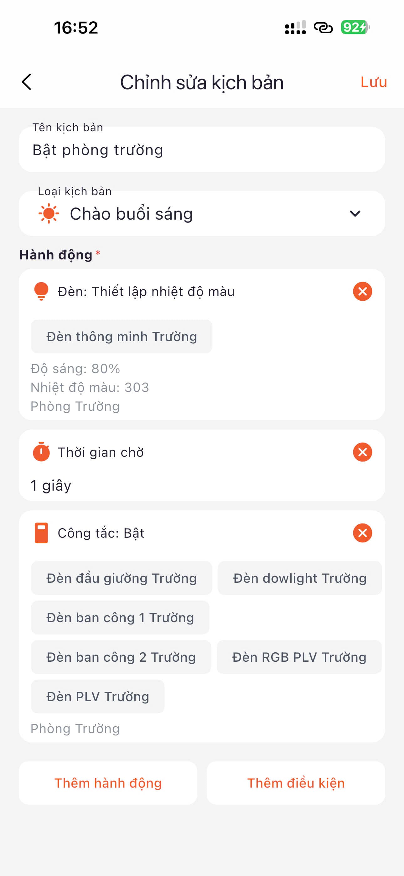 - Ví dụ thực tế: * Tạo kịch bản mang tên "Rời nhà": Khi chạy, nó sẽ tắt toàn bộ đèn, hạ rèm và kích hoạt báo động. Thay vì làm 3 việc, bạn chỉ cần kích hoạt 1 kịch bản.