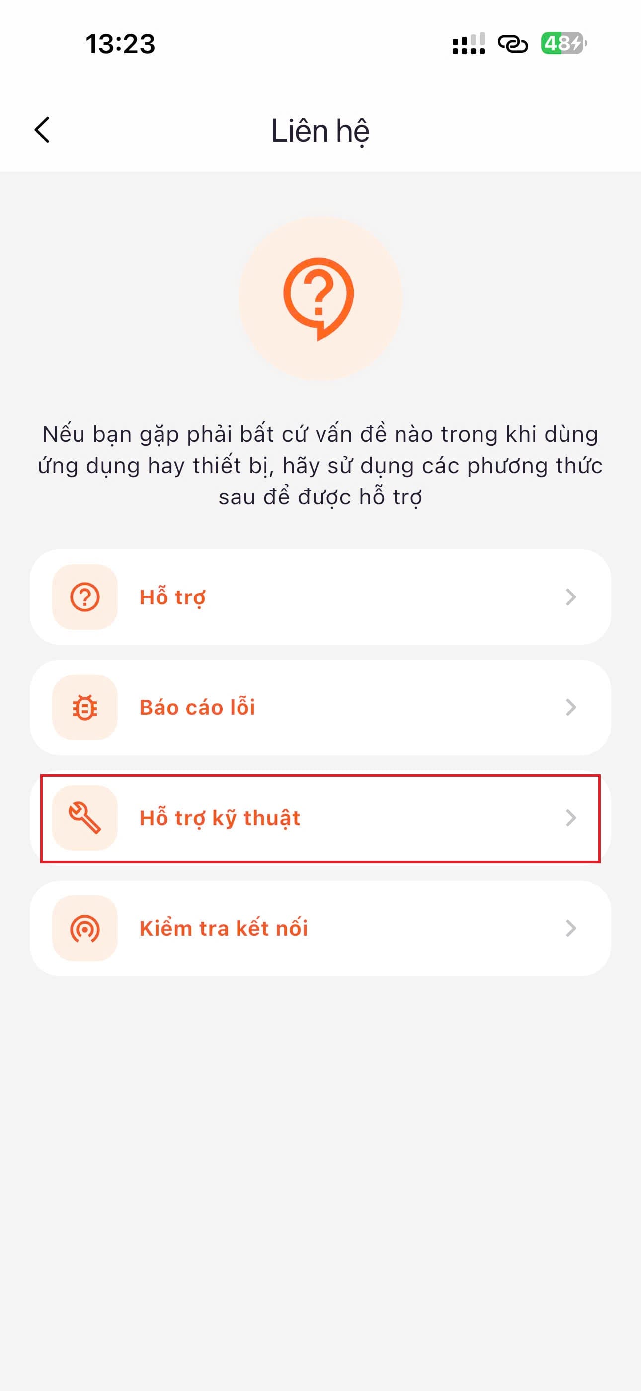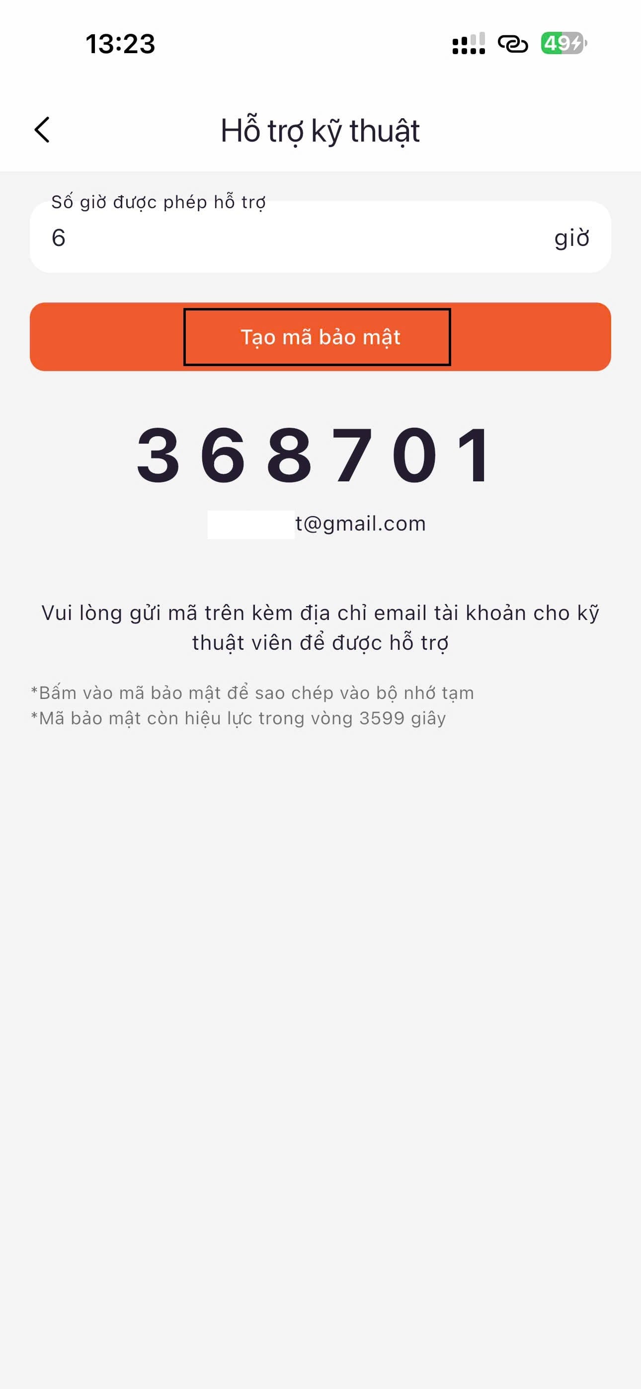 - Nhấn chạm vào mã bảo mật được tạo để tự động copy email và mã hỗ trợ để gửi cho kỹ thuật viên qua Zalo/SMS/Mail. Hoặc có thể chụp ảnh màn hình mã hỗ trợ rồi gửi cho kỹ thuật viên.
