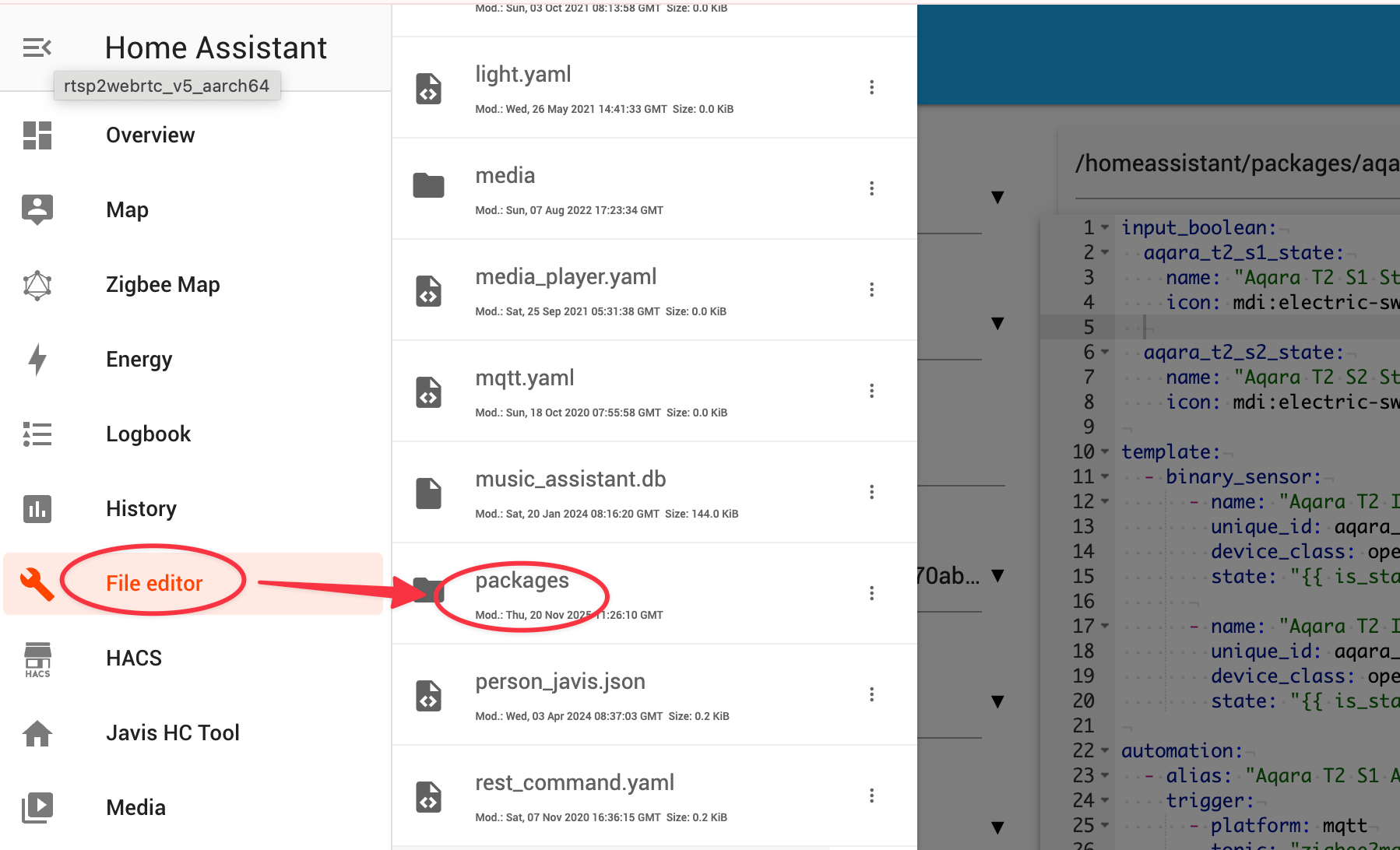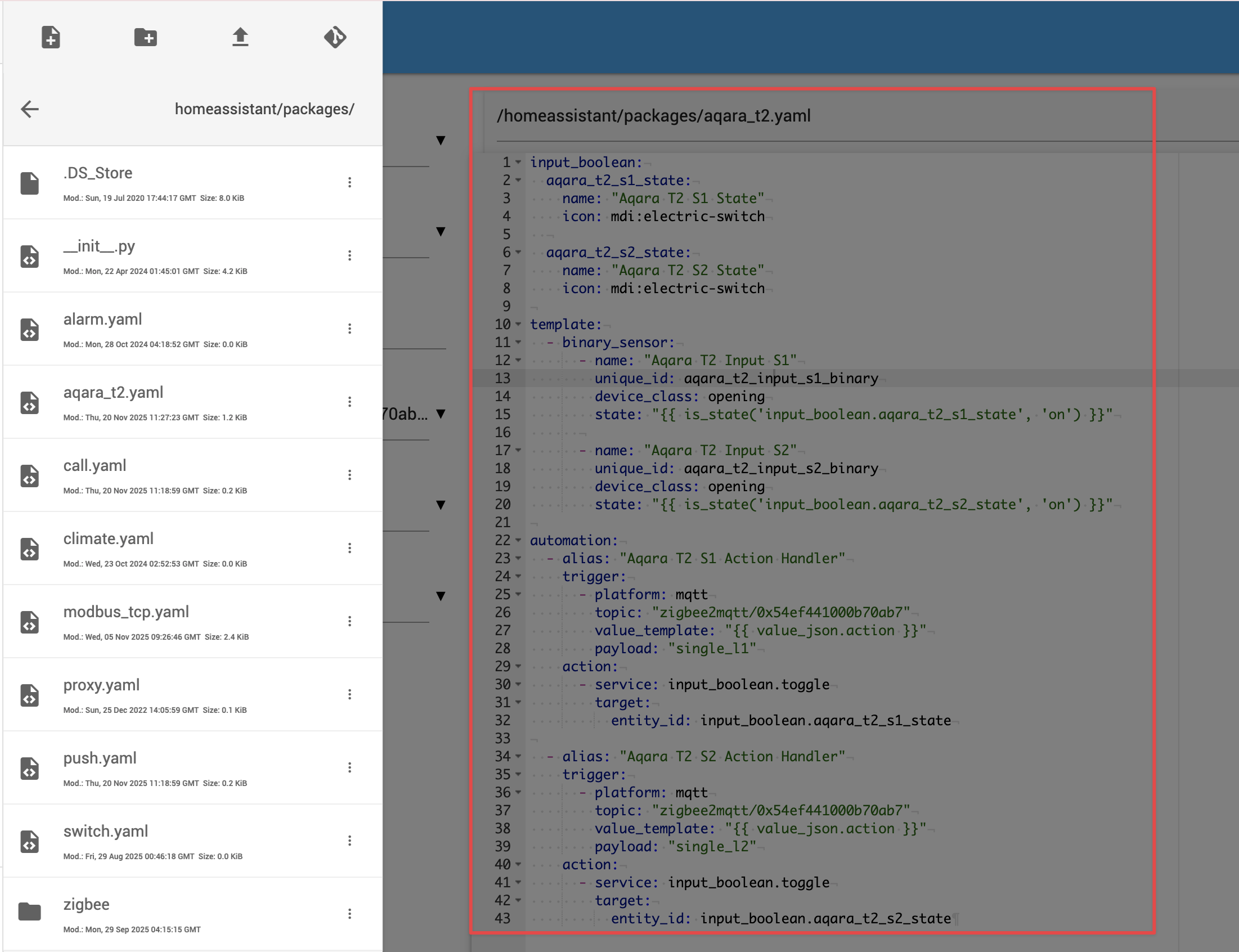 Sau đó tạo 1 file aqara_t2.yaml trong thư mục packages rồi dán nội dung dưới đây: